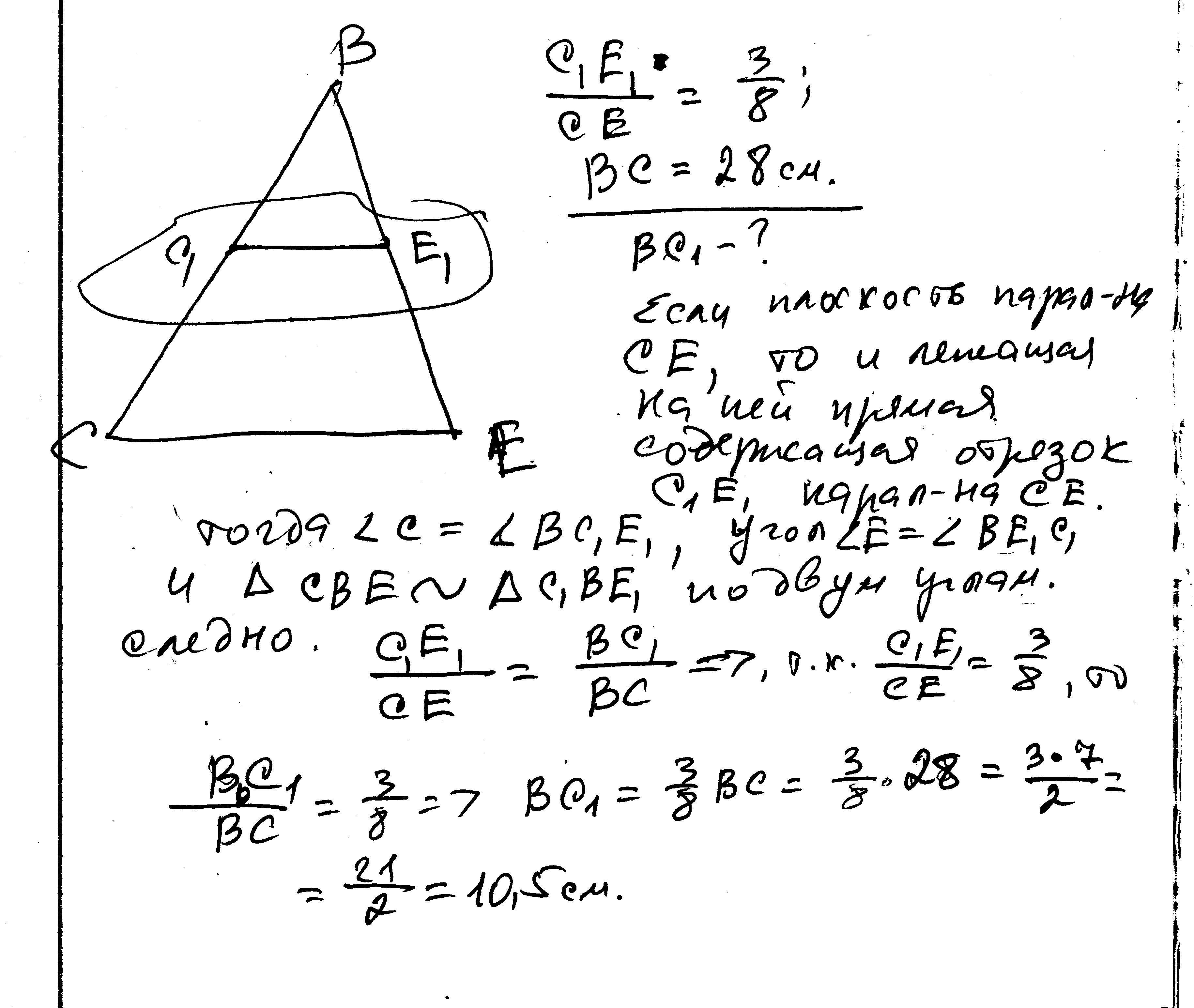 Дан треугольник BCE. Плоскость, параллельна CE, пересекает сторону BE в точке E1, а сторону BC в точке C1. C1E1:CE=3:8, BC=28cm. Найти B1C1.
