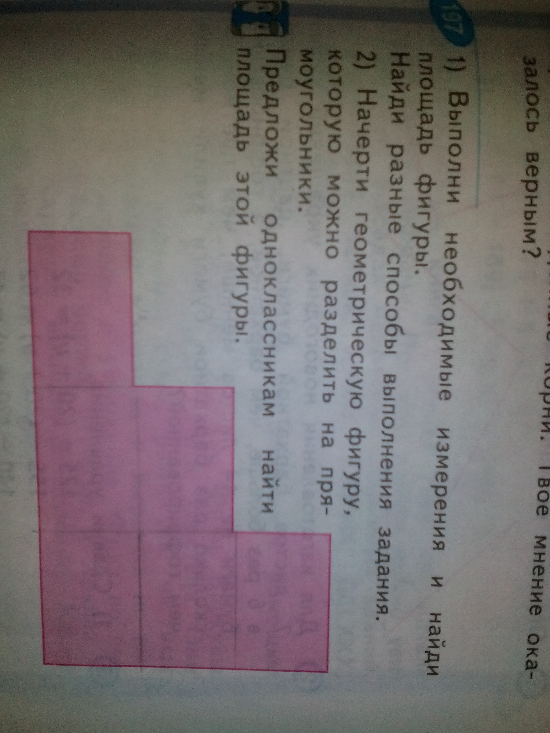 Второй вариант. Раздели фигуру на три прямоугольника и узнай площадь каждого. Потом сложи все эти площади.