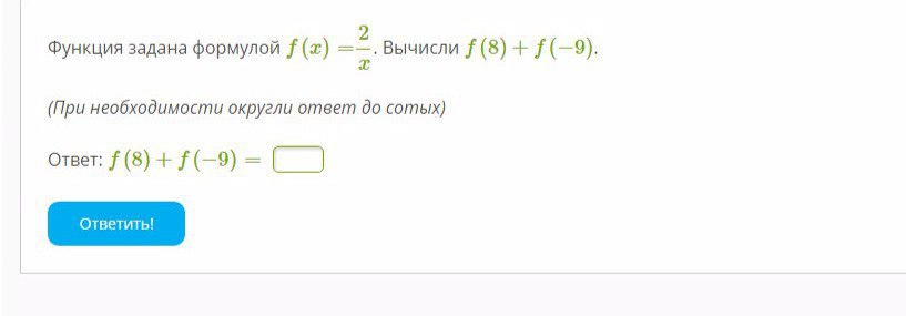 f ( 8 ) + f ( - 9 ) = 1/4 - 2/9 = 9/36 - 8/36 = 1/36 = 0,02777 ~ 0,03