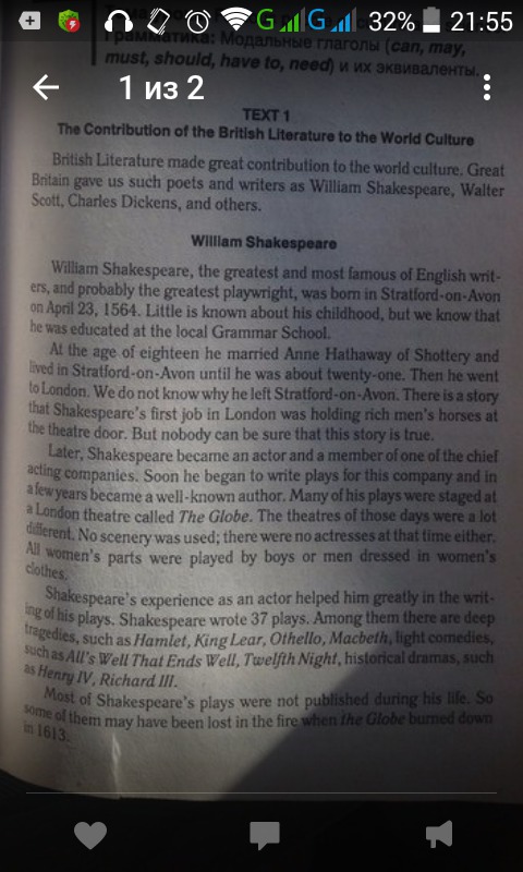 ТЕКСТ 1 Вклад британской литературы в мировой культуре британской литературы сделали большой cottribution к мировой культуре. Великобритания дала нам таких поэтов и писателей , как Уильям Шекспир, Вальтер Скотт, Чарльз Диккенс и другие.