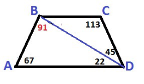∠ABD = 180 - 67 - 22 = 91° - ОТВЕТ
