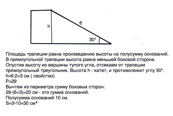Большая боковая сторона прямоугольной трапеции равна 6 см, а острый угол 30. Найдине площадь трапеции, если ее периметр 29 см.