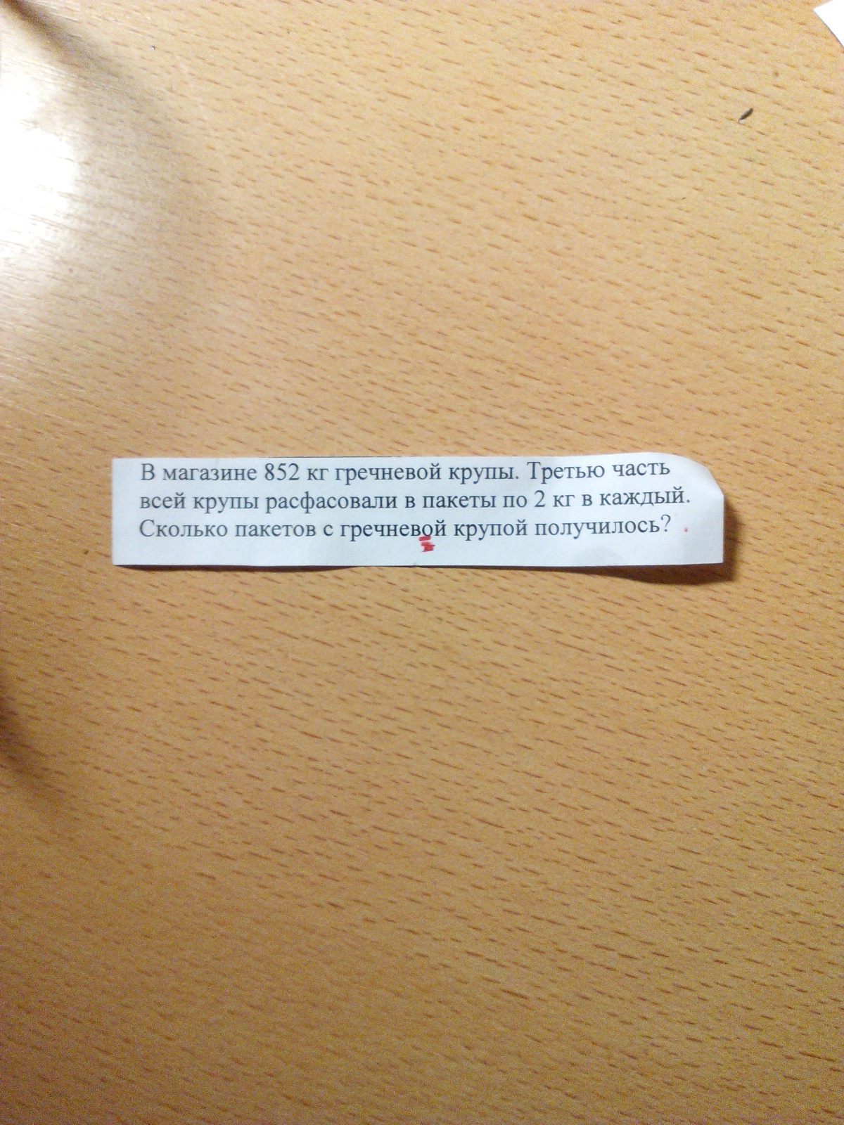 В магазине 852 кг гречневой крупы.Третью часть всей крупы расфасовали по 2 кг в каждый.Сколько пакетов с гречневой крупой осталось?