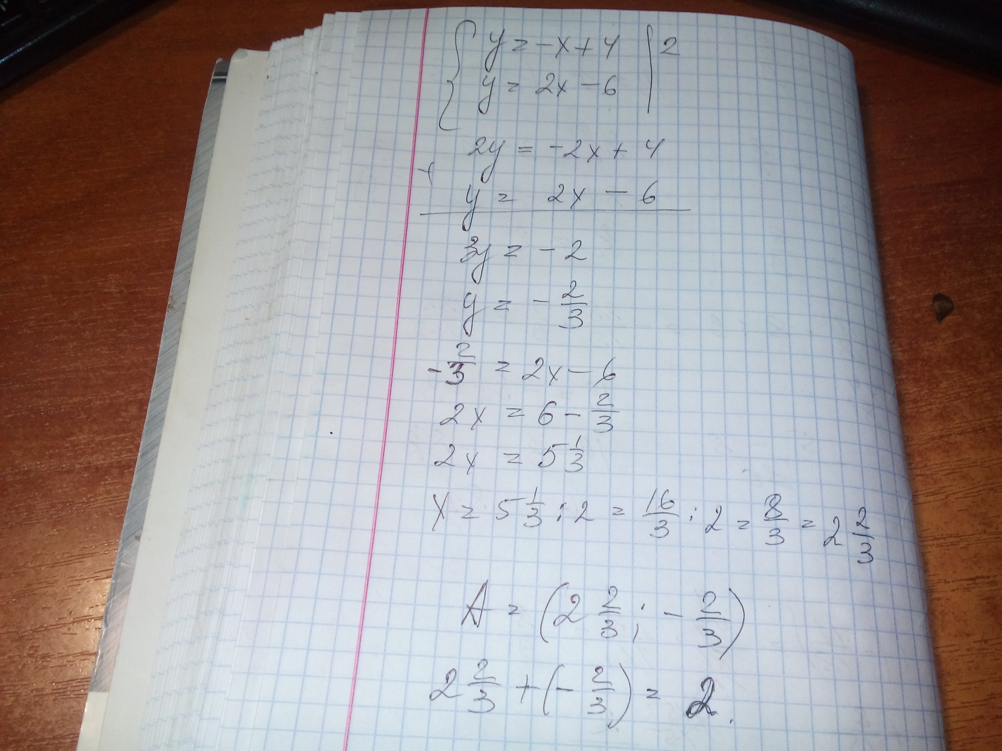 найдите сумму координат точки А, если известно, что эта точка является точкой пересечения графиков функций у=-х+4 и у=2х-6