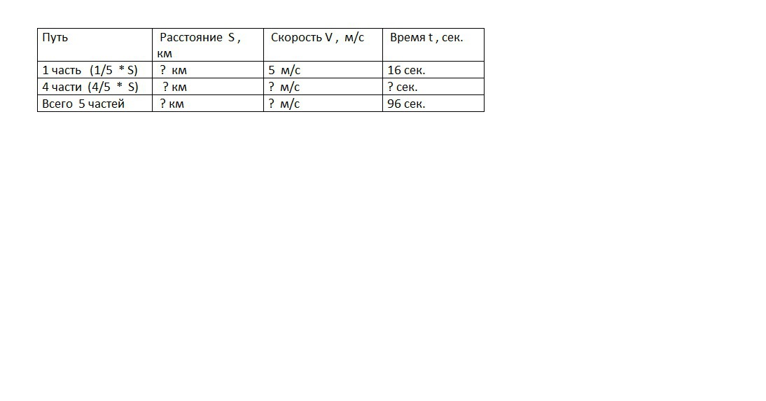 Пятую часть дистанции Петя пробежал за 16 секунд с максимальной скоростью-5м/с.Затем он снизил скорость и на финише показал время 96 секунд.С какой скоростью пробежал Петя остальную часть дистанции?