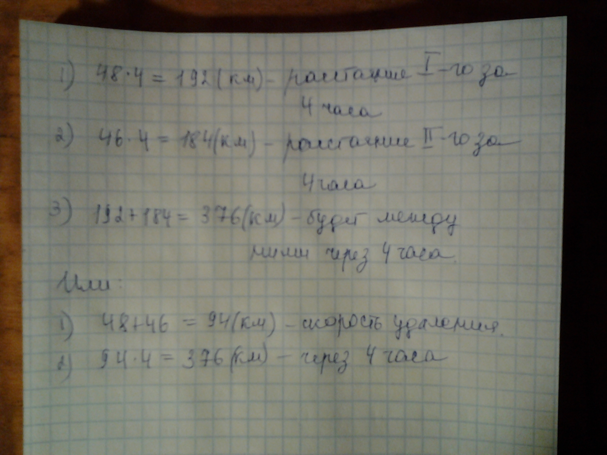 из одного города одновременно в противоположных направлениях выехали два автомобиля. Один из их двигался со скоростью 48 км/ч, а второй 46 км/ч. Какое расстояние будет между ними через 4 ч после начала движения?