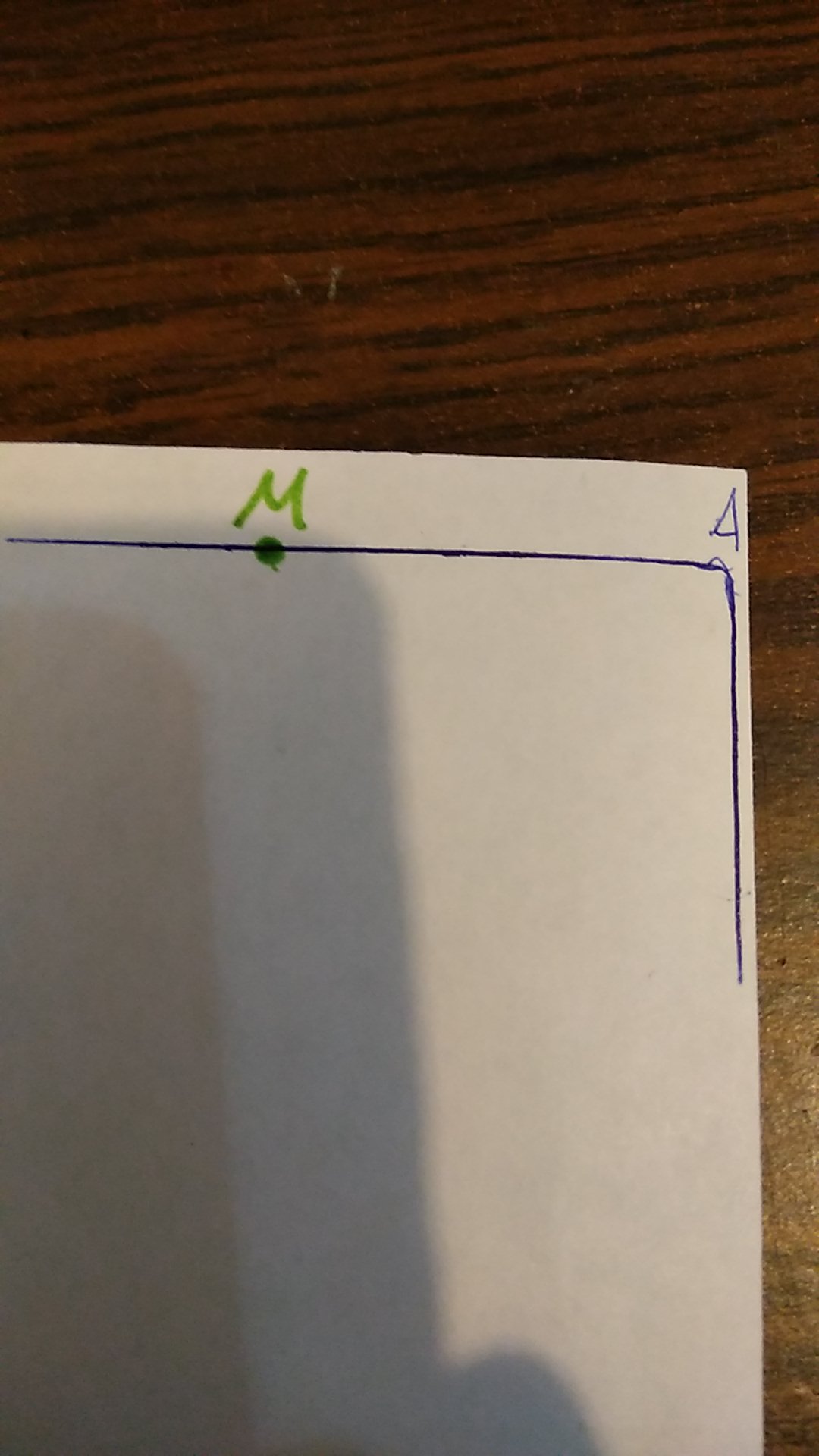 Ставим две буквы- точкаМ и А, друг напротив друга. Отступаем(в противоположную сторону от А) некоторое расстояние от точкиМ и проводим через неё линию, и продлеваем её до А.