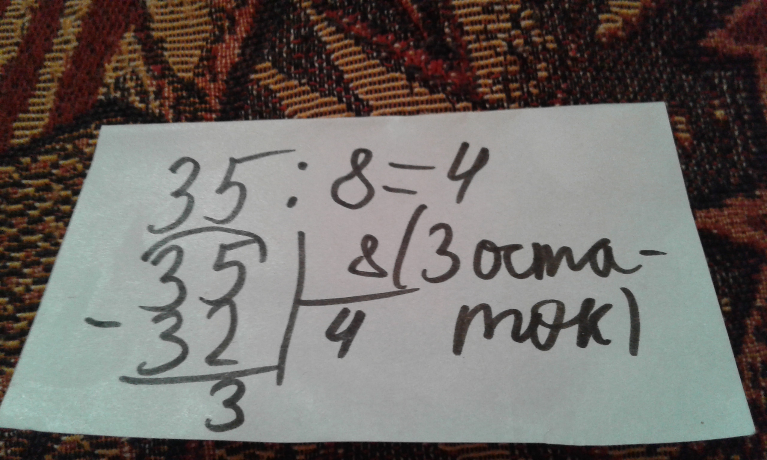 Вот решение на фото. Ответ 4 и остаток 3.