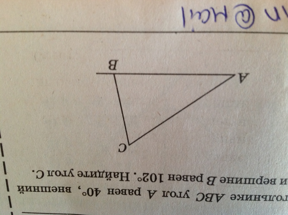 в треугольнике abc угол А равен 40 градусов,внешний угол при вершине В равен 102 градуса найдите угол с