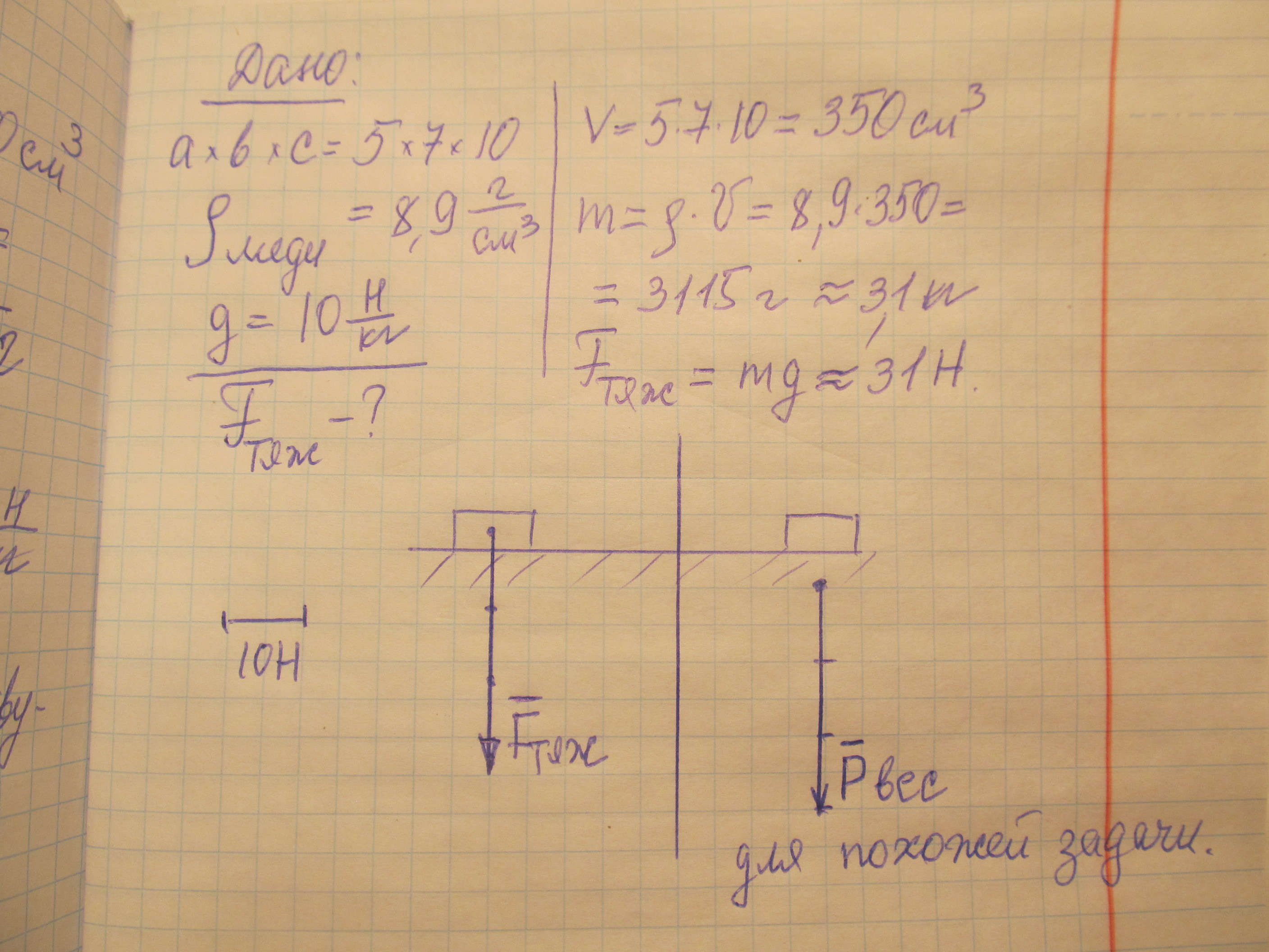 Медный брусок размером 5см,7см,10см. Лежит на столе найти силу тяжести и изобразить её на чертеже используя масштаб 1 см=10н!