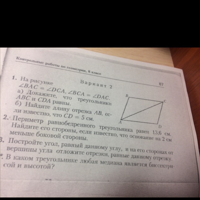 AC-общая, следовательно треугольник ABC равен треугольнику CDA чтд.