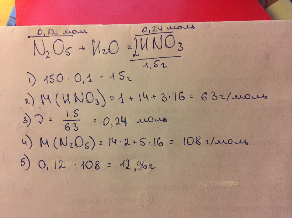 найдите массу оксида азота(V) который требуется для получения 150г раствора азотной кислоты с массовой долей HNO3 равной 10%