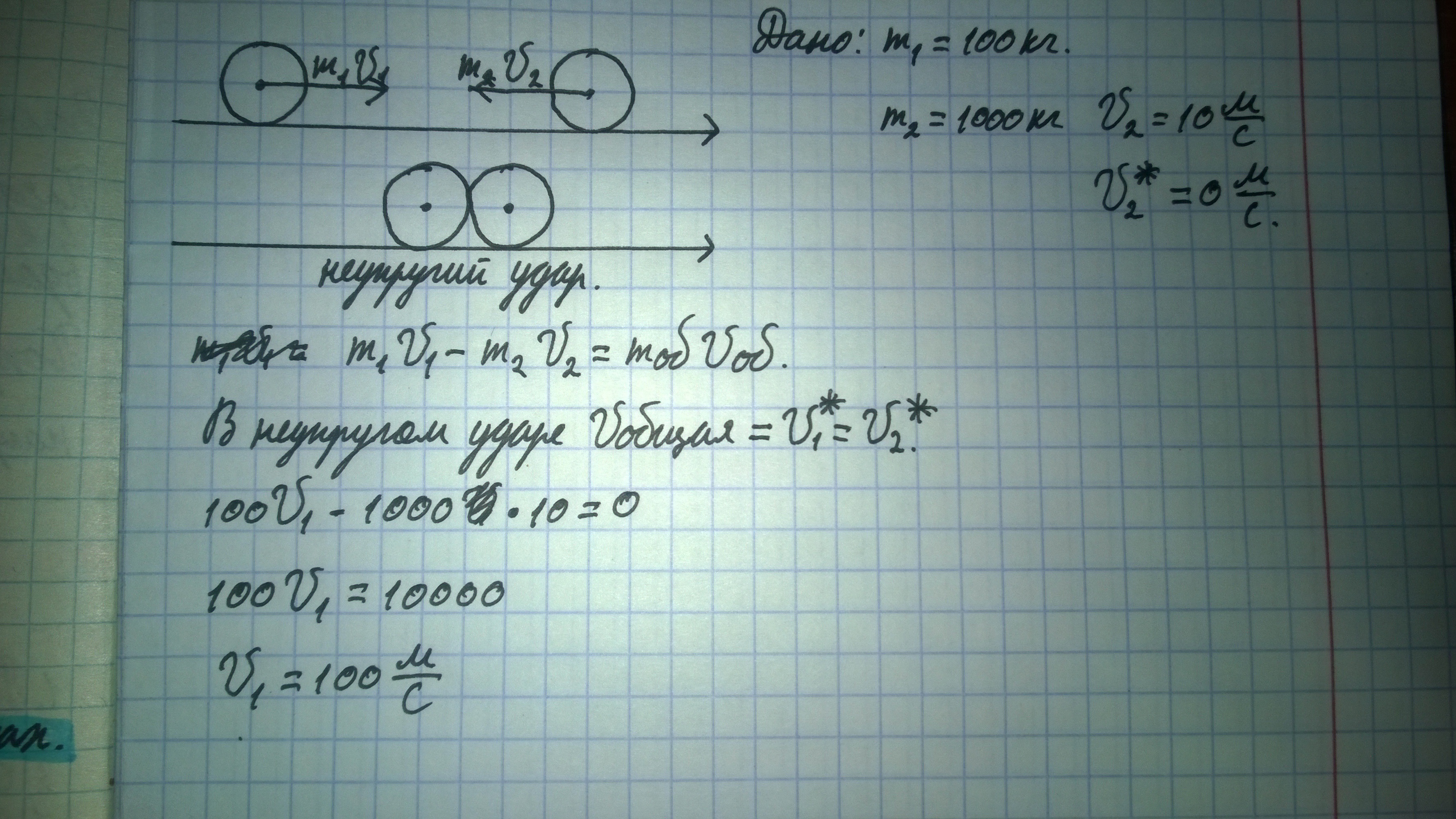 Нужно узнать скорость u тела с массой m=100кг,в случае упругого и неупругого удара с телом с массой M=1000кг и скоростью v1=10м/с,после удара его скорость v2=0