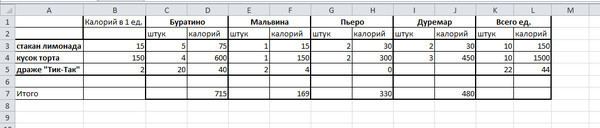 выпито, кусков торта и драже «Тик-Так» съедено; сколько калорий употребил каждый участник
