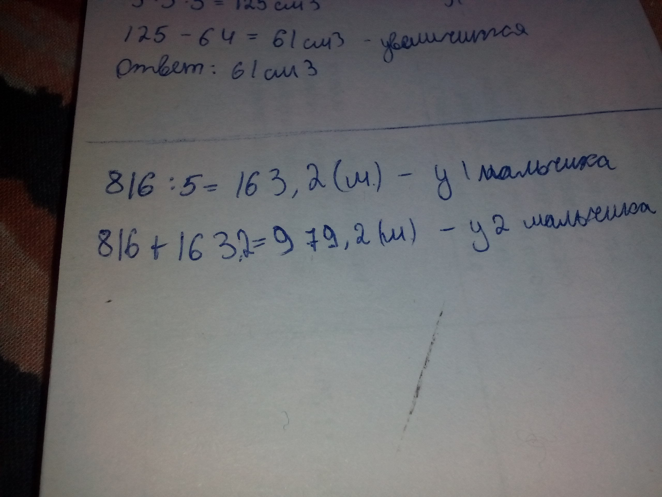 у одного мальчика в 5 раз больше марок чем у другого.сколько марок у каждого мальчика если у одного из них на 816 марок больше?