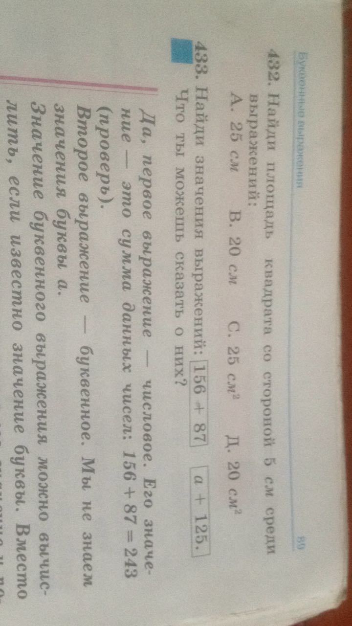 найди площадб квадрата со стороной 5 см среди выражений;А.25см.В.20см.С.25см2.Д.20см2.упр.432.