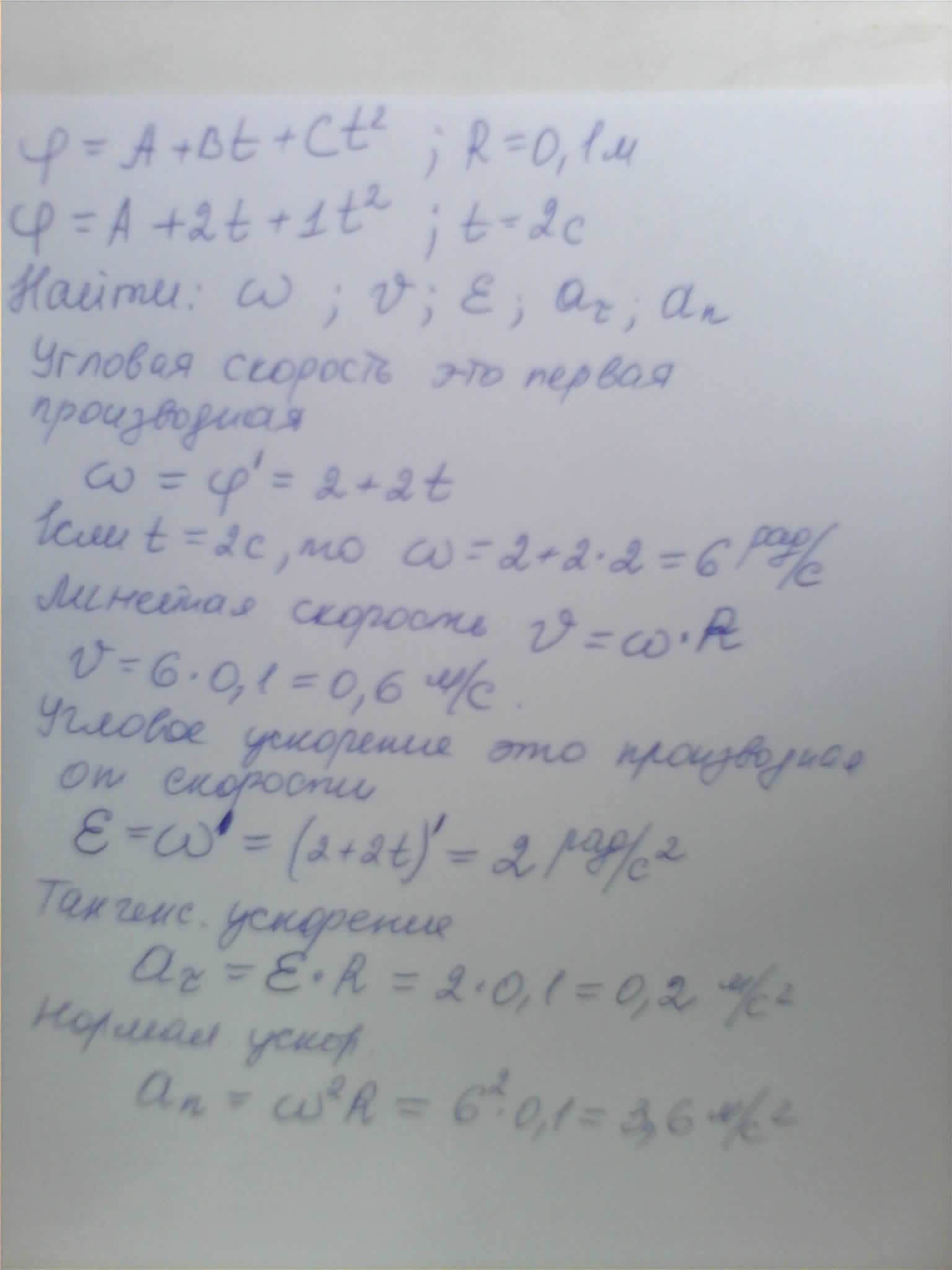 Колесо радиусом R = 0,1м вращается так, что зависимость угла поворота радиуса колеса от времени дается уравнением φ = А + Bt + Сt2, где В = 2 рад/с и С = 1 рад/с3. Для точек, лежащих на ободе колеса, найти через время t = 2 с после начала движения: а) угловую скорость ω; б) линейную скорость v; в) угловое ускорение ε ; г) тангенциальное аτ и нормальное ап ускорения.