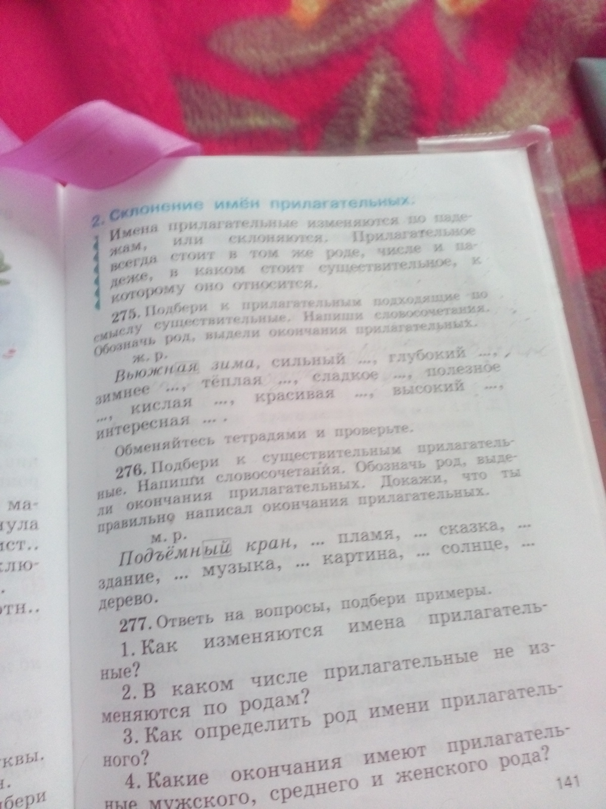 сильнЫЙ м.р. ветер, глубокИЙ м.р. обрыв, зимнЕЕ ср.р. солнце, тёплАЯ ж.р. вода, сладкОЕ ср.р. мороженое, полезнОЕ ср.р. лекарство, кислАЯ ж.р. клюква, красивАЯ ж.р. девочка, высокИЙ м.р. человек, интереснАЯ ж.р. книга