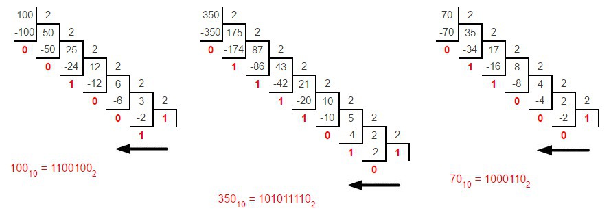 100(10) = 1100100(2), 350(10) = 101011110(2), 70(10) = 1000110(2)