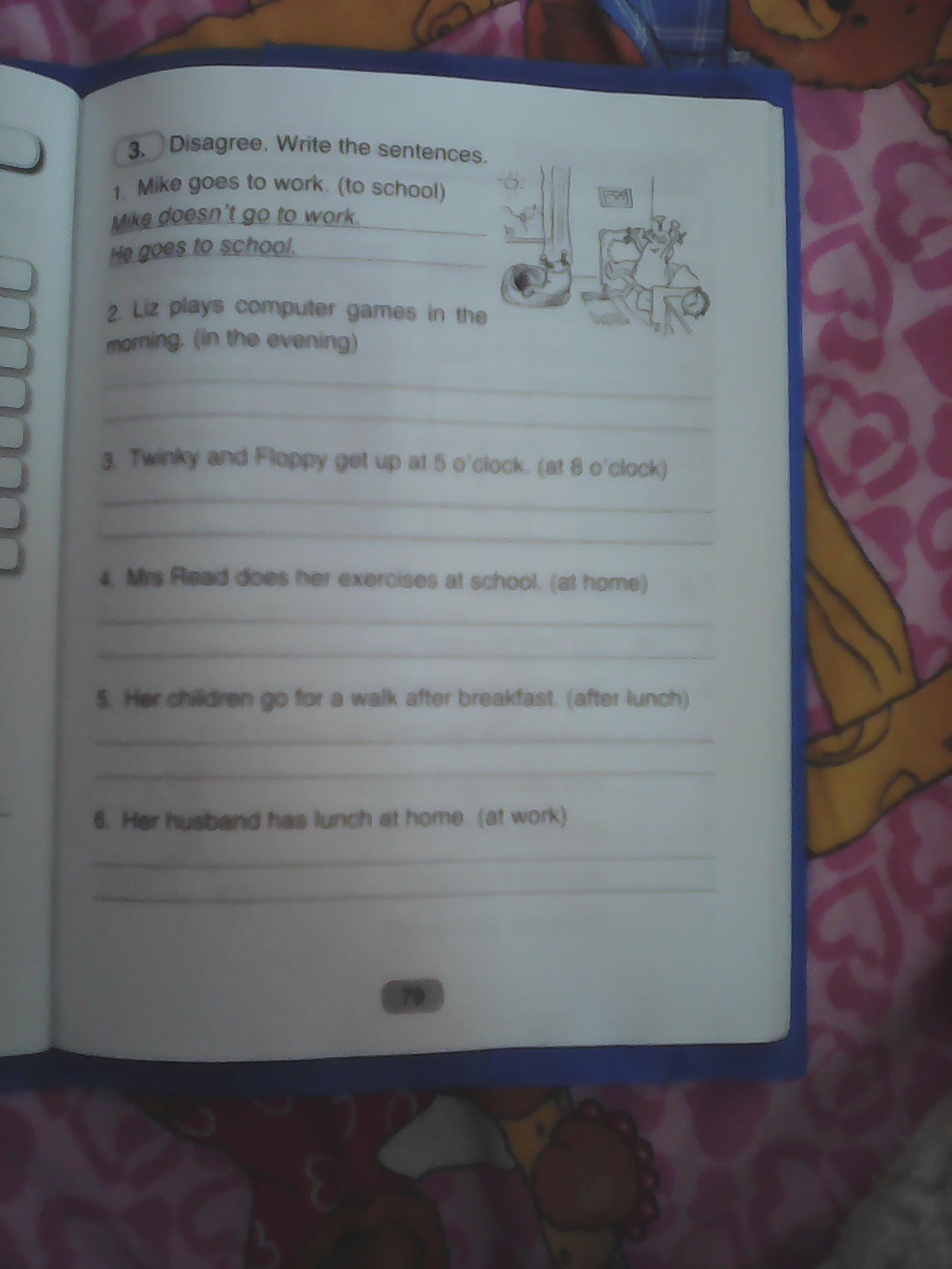 1.Liz doesn't play computer games in the morning. She plays in the evening 2.The haven't get up at 5 o'clock. They get up at 6 o'clock. 3.Her children haven't go for a walk after breakfast. They go after lunch. 4.Her husband hasn't lunch at home. He lunch at work.