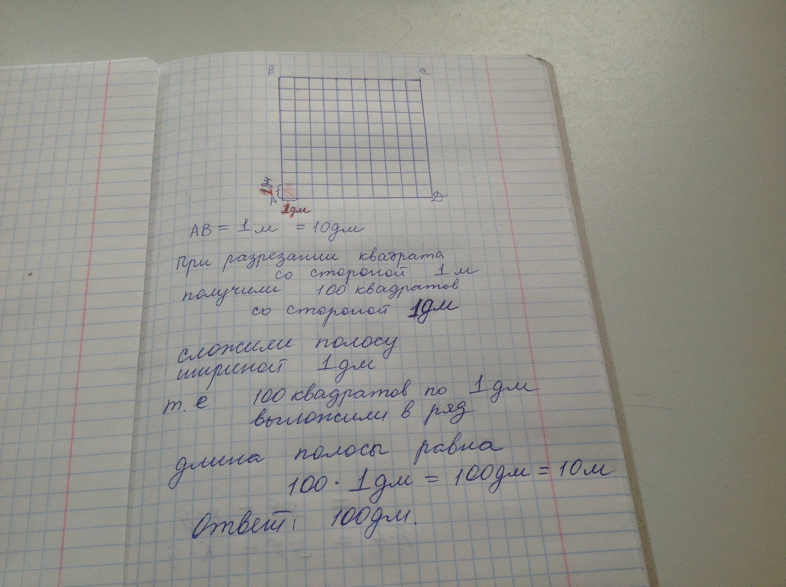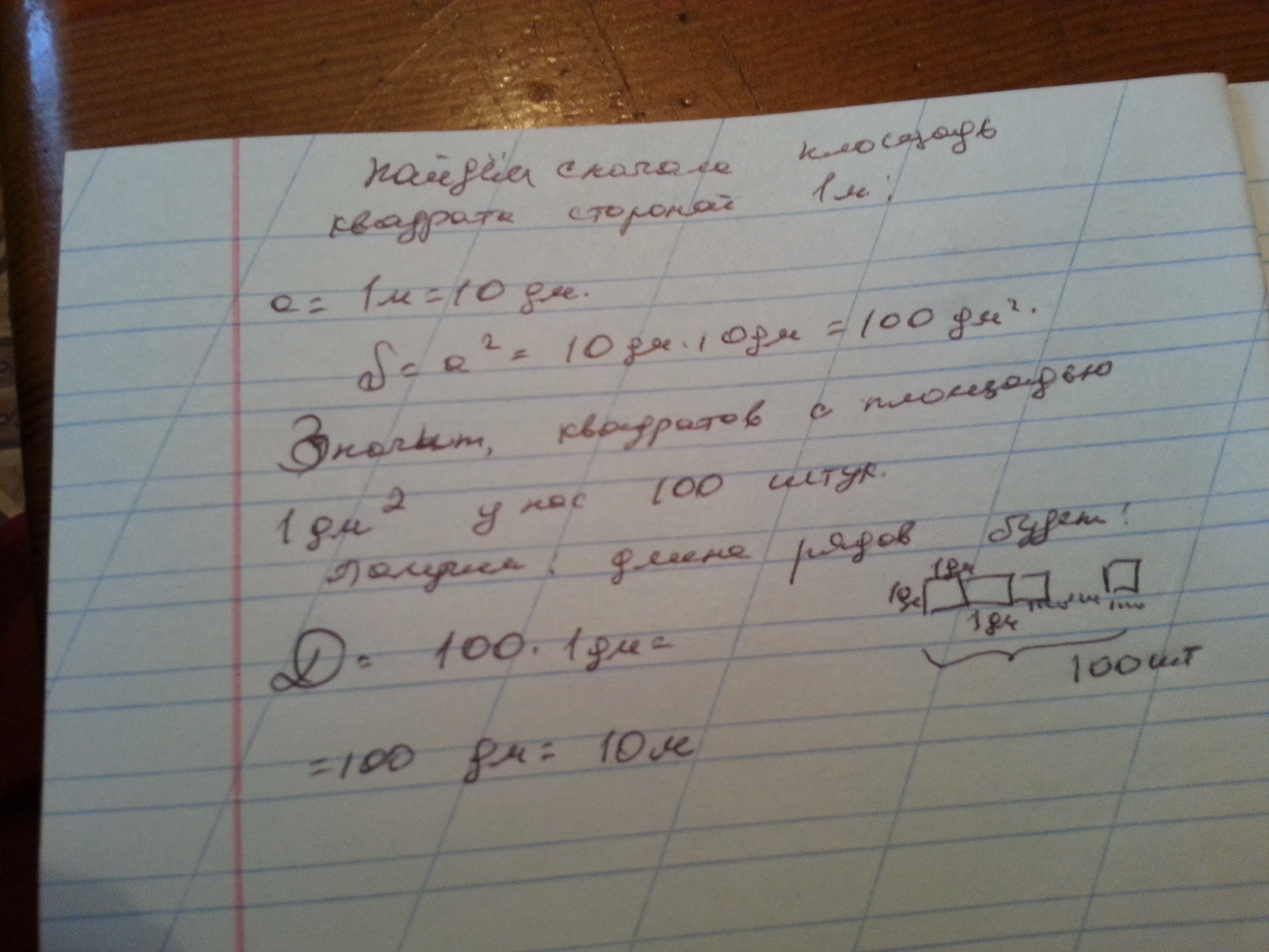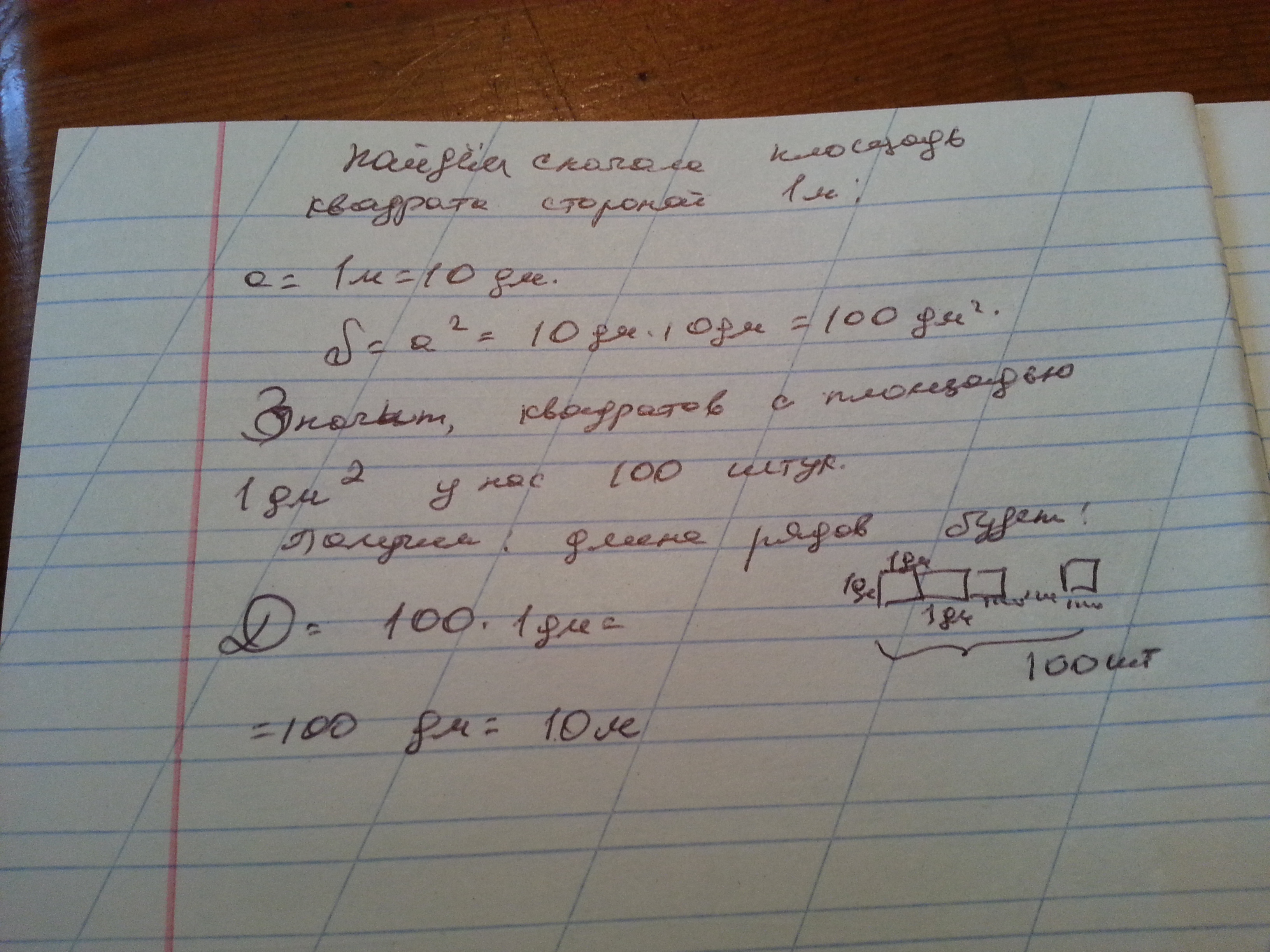 Квадрат со стороной 1 м разрезали на квадраты со стороной 1 дм и сложили полученные квадраты в ряд.Какой длины получился ряд?срочно!