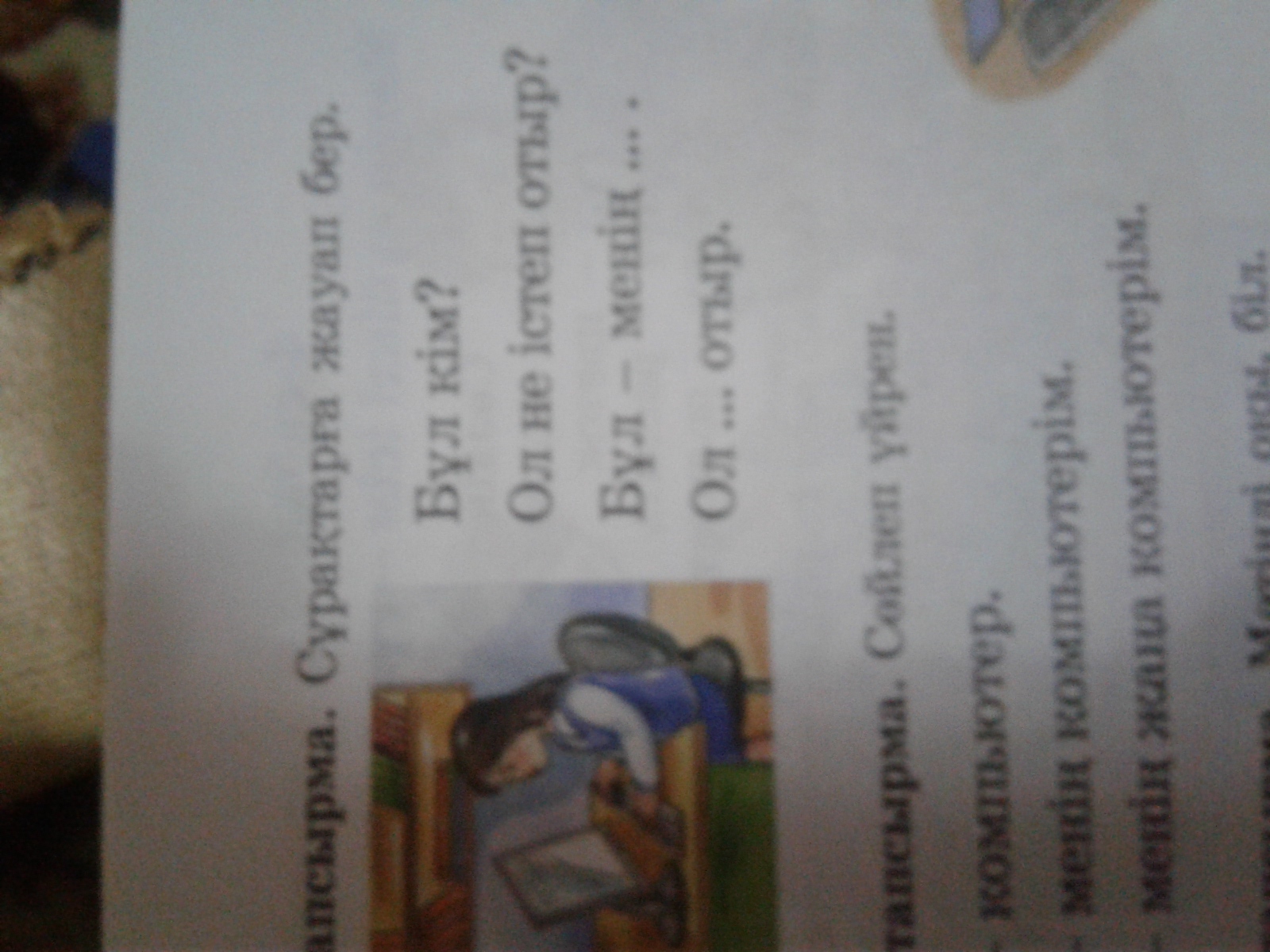 Ответь на вопросы кто это? Пишешь бул Анеля к примеру Что он (а)делает? Ол компьютер алдында отырадв