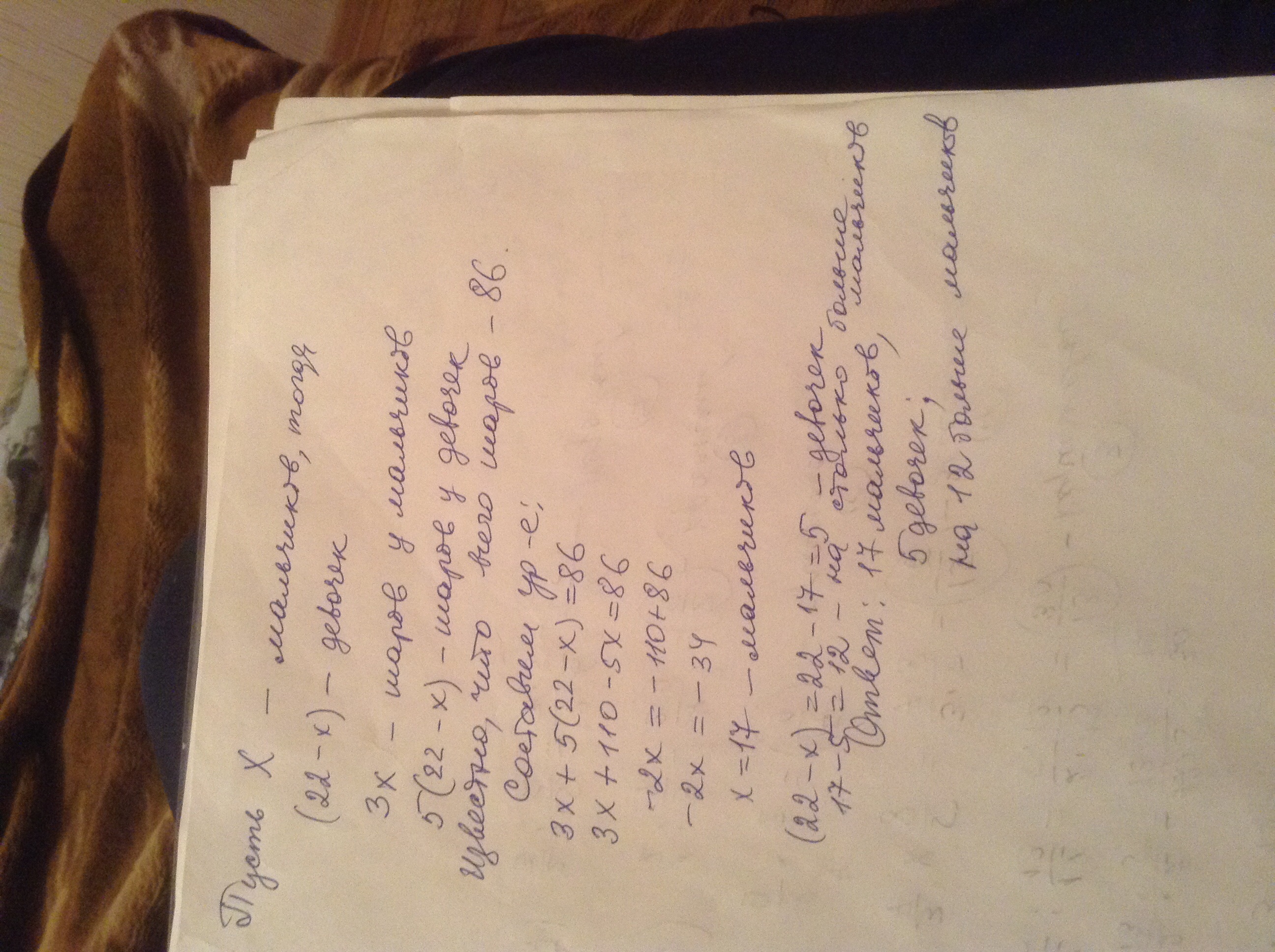 Решите задачу.На празднике 22 ученика,у каждого мальчика по 3 шарика,у каждой девочки по 5 шариков.Всего надули 86 шаров.Кого было больше на празднике мальчиков или девочек и насколько.Только если через уравнение то только с Х и без У.А лучше по действиям с пояснениями!