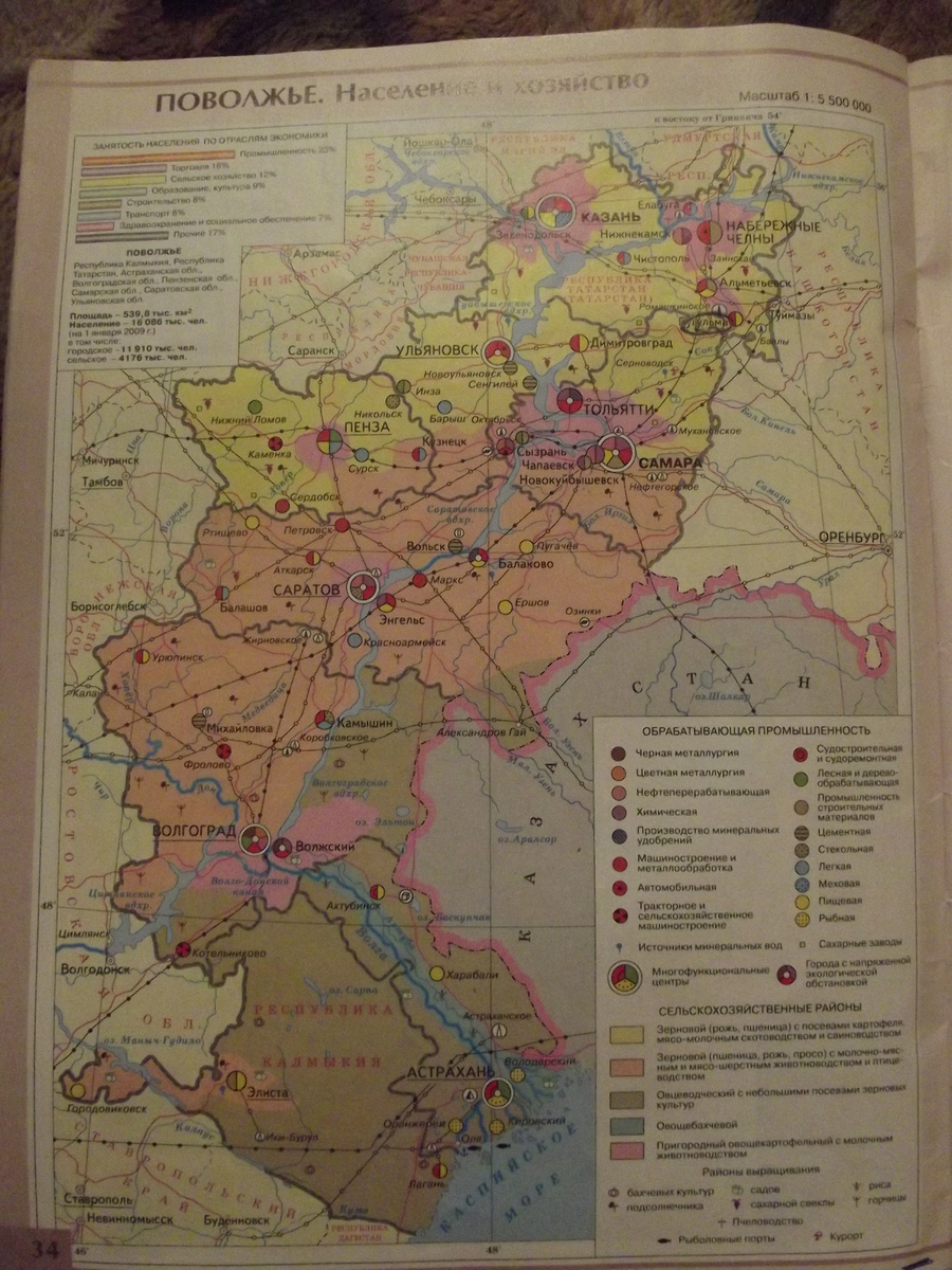Машиностроение (автомобильное)-Казань, Набережные Челны, Альметьевск, Бугульма, Самара, Тольятти, Саратов, Пенза, Волгоград, Астрахань, Ульяновск; химическая-Казань, Самара, Саратов, Тольятти; пищевая-Казань, Бушулма, Пенза, Ульяновск, Самара, Астрахань(рыбная); меховая-Казань, лесная-Пенза, Астрахань, Волгоград; производство строительных материалов-Набережные Челны;стекольная-Саратов, Камышин.