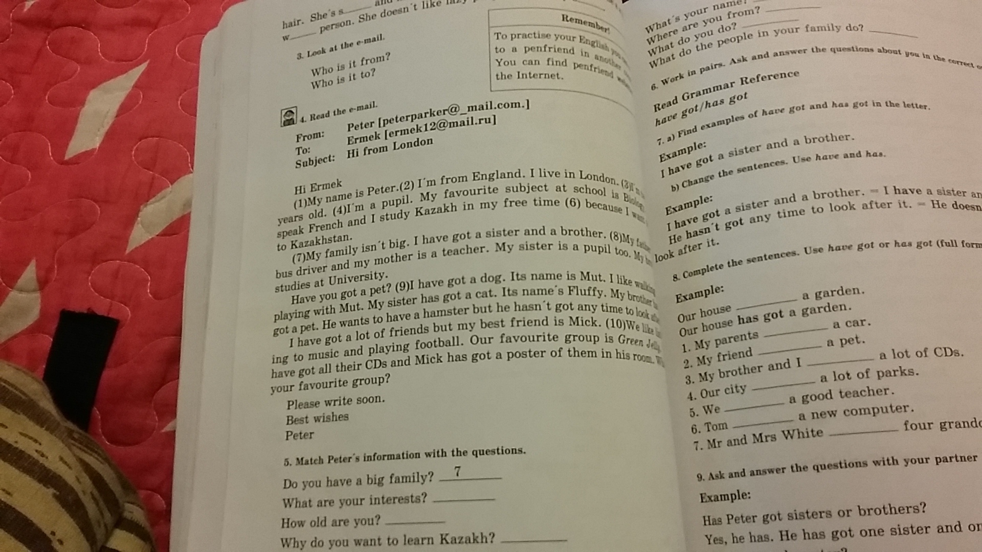 Привет Ермек. Меня зовут Питер. Я из Англии.Я живу в Лондоне. Мне 12 лет. Я ученик. Мой любимый урок в школе биология. Я говорю на французском и я учю казахский в свободное время, потому что я хочу поехать в Казахстан. Моя семья не большая. У меня есть сестра и брат. Мой папа водитель автобуса и моя мама учительница. Моя сестра школьница. Мой брат учиться в университете. У тебя есть животные? У меня есть собака. Его имя Мут. Я люблю гулять и играть с Мутом. У моей сестры есть кошка. Её имя Флаффи. У моего брата нет питомца. Он хочет хомяка, но он потеряет много времени ухаживая за ним. У меня много друзей, но мой лучший друг Майк. Мы любим слушать музыку и играть в футбол. Наша любимая группа "Зелёное Желе". У нас много их дисков и у Майка в доме есть их постер. Какая твоя любимая группа?
