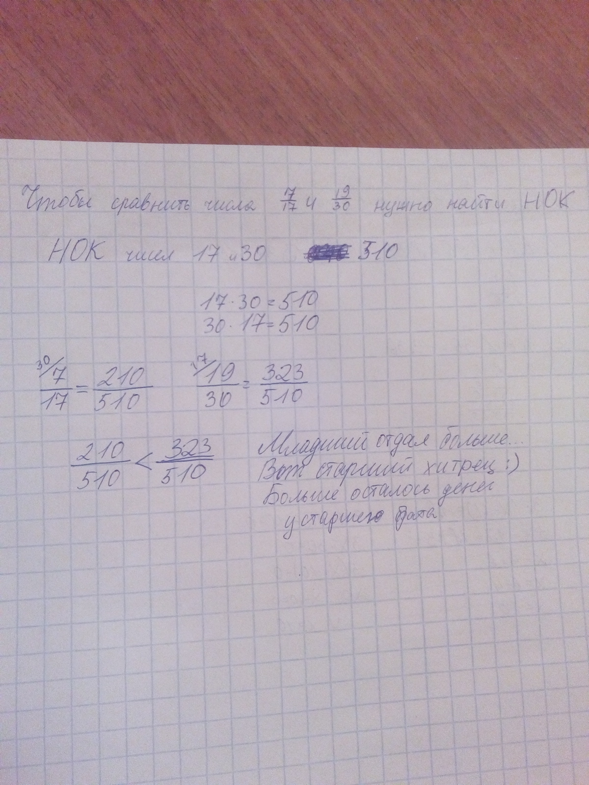 два брата у которых было поровну денег, купили диск с комптютерной игрой. старший отдал зи игру 7/17 своих денег а младший 19/30своих денег у кого из них осталось больше денег (С ОБЬЯСНЕНИЯМИ)