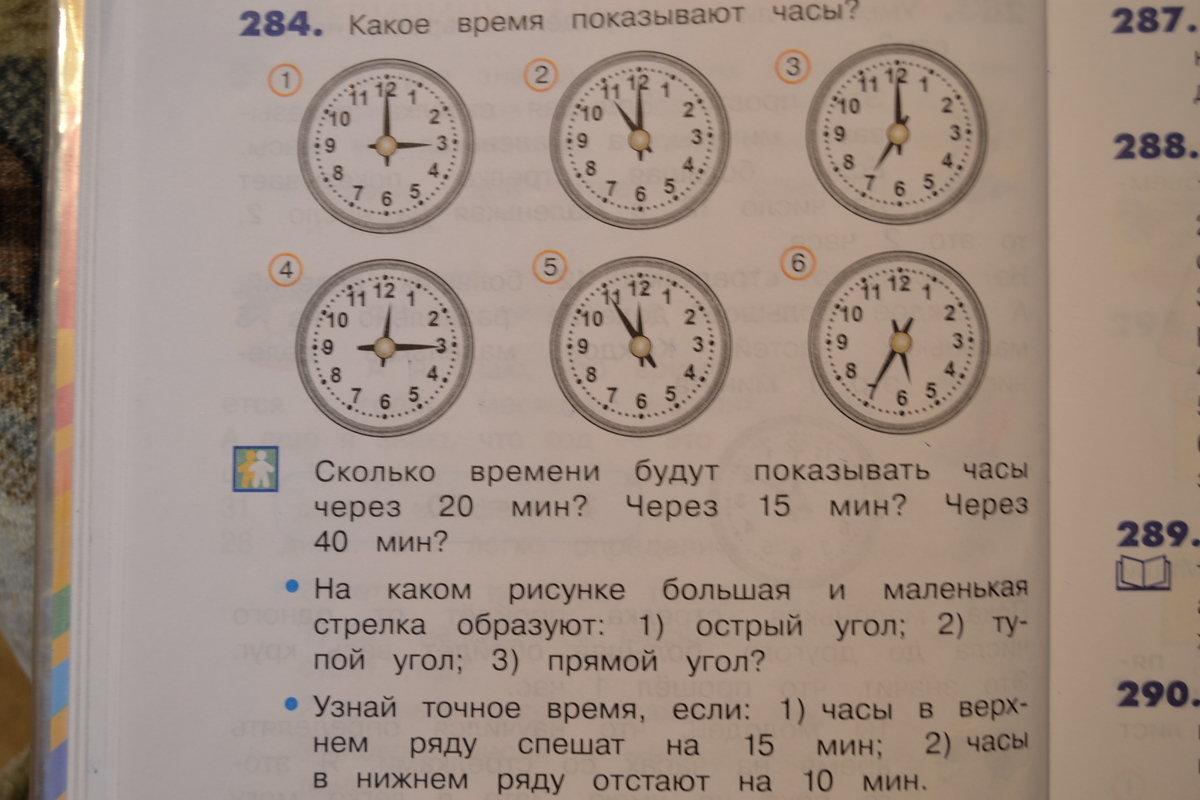 На каком рисунке большая и маленькая стрелка образуют:1)острый угол;2)тупой угол;3)прямой угол.