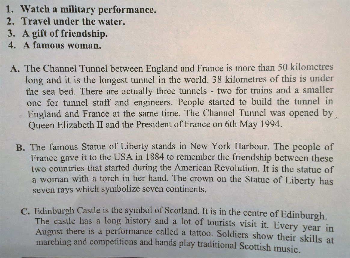 Прочитайте тексты и установите соответствие между заголовками 1–4 и заголовками A–C. Запишите свои ответы в таблицу. Используйте каждую цифру только один раз. В задании есть один лишний ответ.