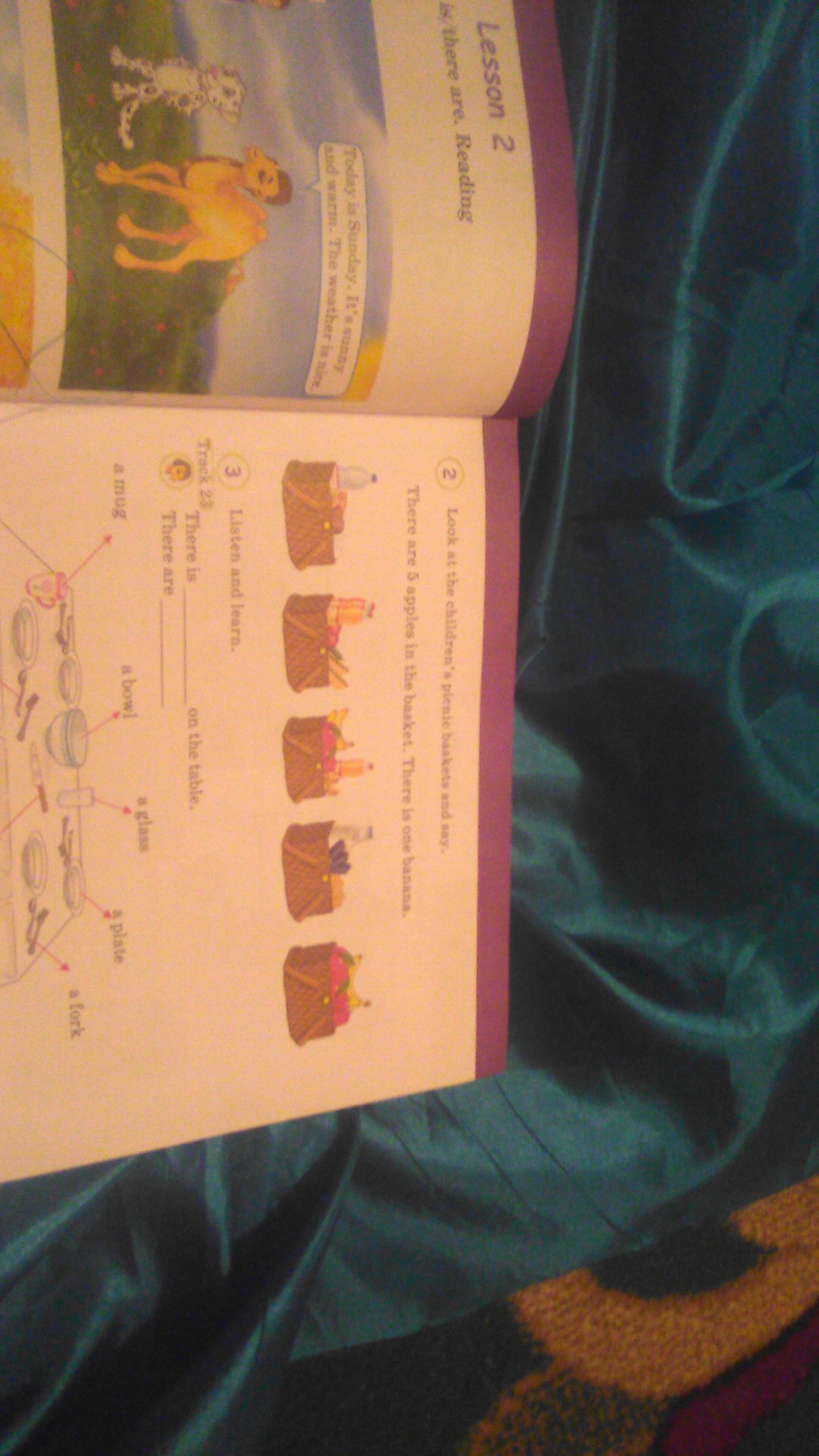 Look at the children's picnic baskets ang say. There are 5 apples in the basket. There is one banana.