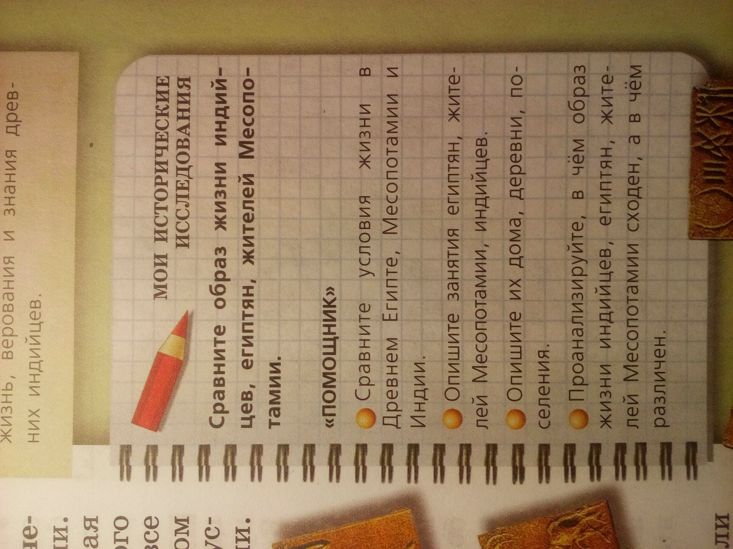Египтяне строили дома из обмазанного глиной тростника. в Египте было мало древесины, но в изобилии рос тростник по берегам Нила. Жители Месопотамии строили дома из глиняных кирпичей и из камня. в Двуречье в избытке было глины и камня, но очень мало древесины. Индийцы строили дома из древесины и тростника. в стране было много лесов. Египтяне, жители Месопотамии и индийцы занимались земледелием. их государства располагались по течению крупных рек и было много плодородной земли. В зависимости от географических особенностей занятия жителей также и различались, например, в Месопотамии было развито рыболовство и мореплавание, тогда как в Египте мореплавание было развито слабо.