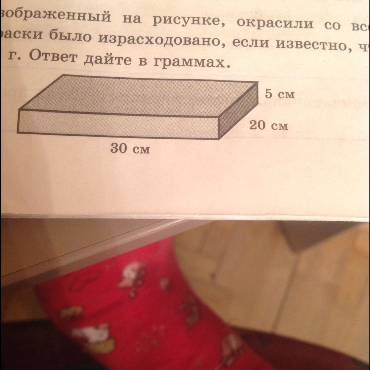 Помогите пожалуйста. Брусок, изображенный на рисунке ,окрасили со всех сторон. Сколько краски было израсходовано,если известно, что на 1 дм2 требуется 3 г. Ответ дайте в граммах