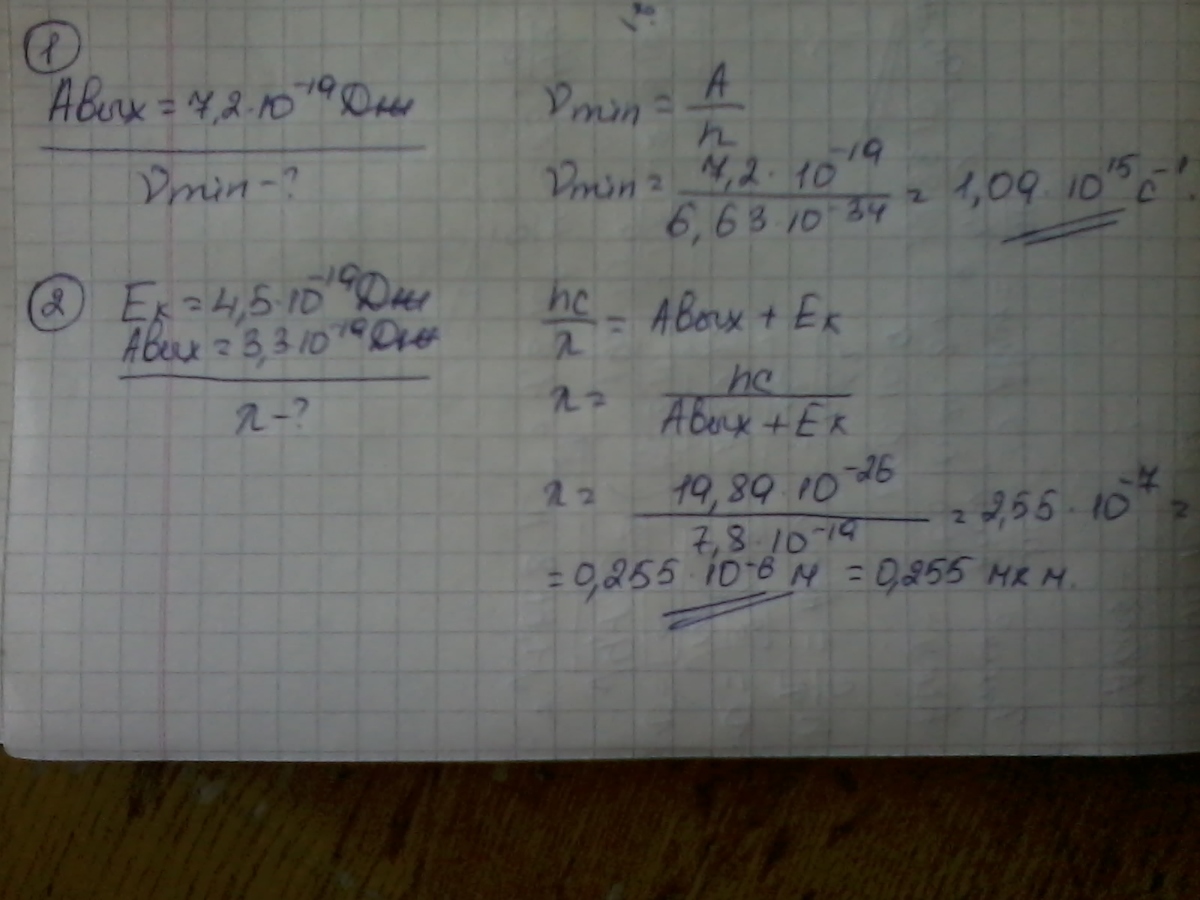 1. Определить красную границу фотоэффекта для вольфрама с работой выхода 7,2*10^-19 Дж. 2. Определить длину волны света, которым освещается поверхность металла, если фотоэлектроны имеют кинетическую энергию 4,5*10^-19 Дж, а работа выхода равна 3,3*10^-19 Дж.