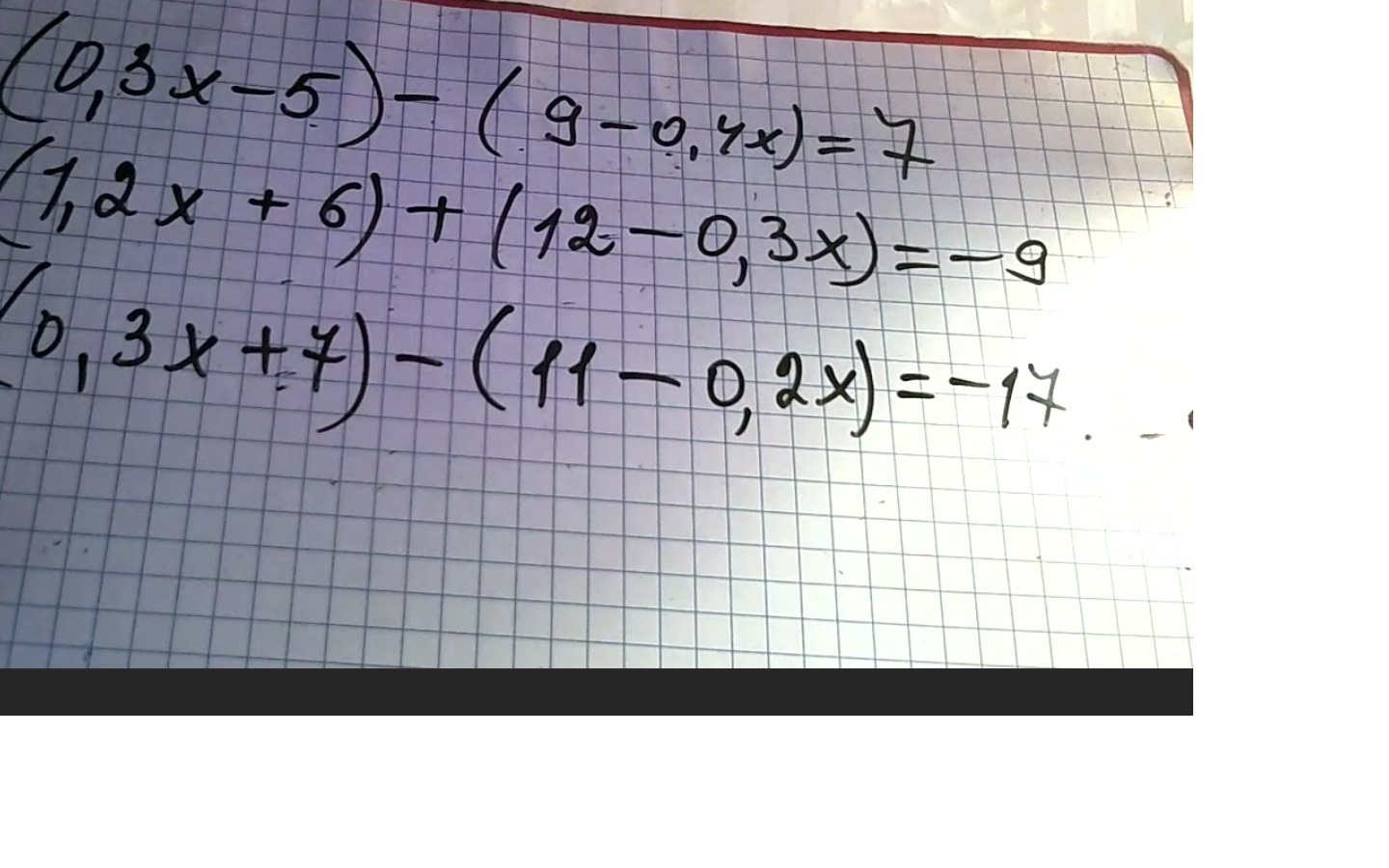 1. \ (0,3x-5)-(9-0,4x)=7; \ 0,3x-5-9+0,4x=7; \ 0,7x=21; \ x=30. \ 2. \ (1,2x+6)+(12-0,3x)=-9; \ 1,2x+6+12-0,3x=-9; \ 0,9x=-27; \ x=-30. \ 3. \ (0,3x+7)-(11-0,2x)=-17; \ 0,3x+7-11+0,2x=-17; \ 0,5x=-13; \ x=-26.