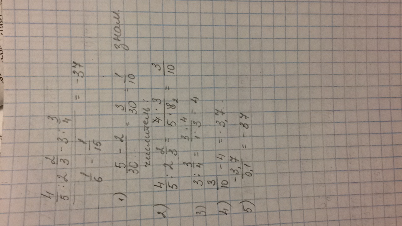 1)4/5:2 2/3=4/5:8/3=4/5*3/8=3/10=0.3; 4 и 8 сокращается на 4