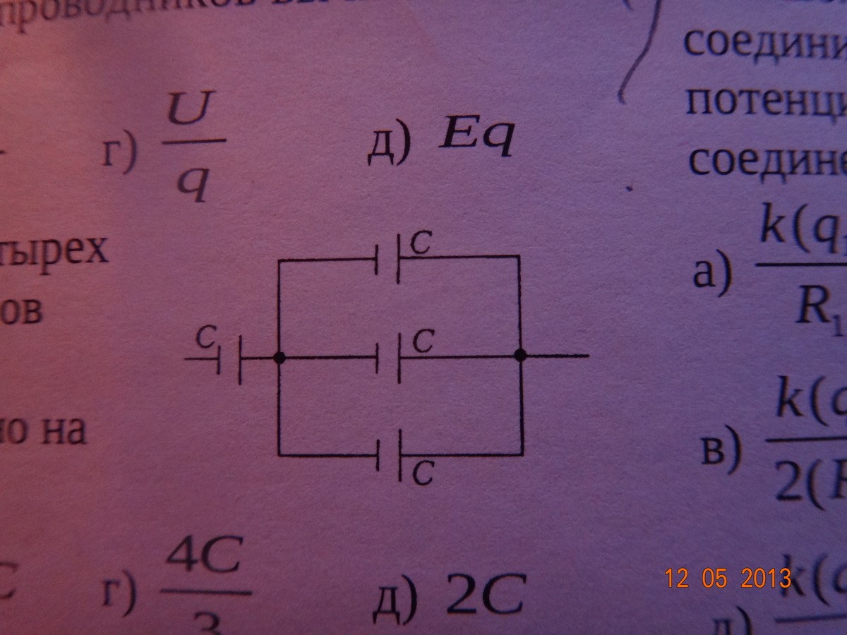 Емкость батареи из четырёх одинаковых конденсаторов емкостью С каждый, соединенных как показано на схеме, равна?