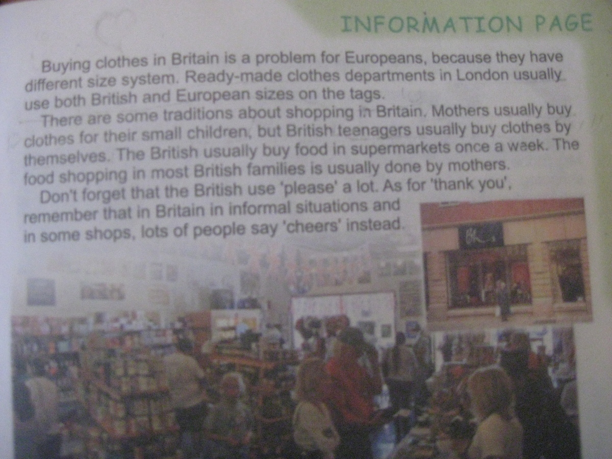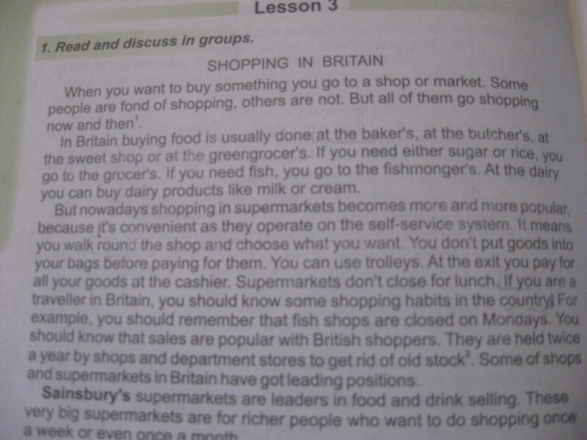 Но в наши дни шопинг в супермаркетах все более и более популярен, потому что это удобно, поскольку они работают на систему самообслуживания. Например, вы ходите по магазину и выбираете что вам нужно. Вы не помещаете товары в свою сумку, пока не оплатили их. Вы можете использовать тележки. На выходе вы платите за все ваши товары на кассе.Супермаркеты не закрываются на обед. Если вы путешествуете по Британии, вы должны знать некоторые покупательские привычки в этой стране. Например, вы должны помнить, что рыбные магазины закрыты по понедельникам. Вы должны знать, что распродажа популярна среди британских покупателей.Они проводятся два раза в год магазинами и универмагами, чтобы избавится от старых запасов.