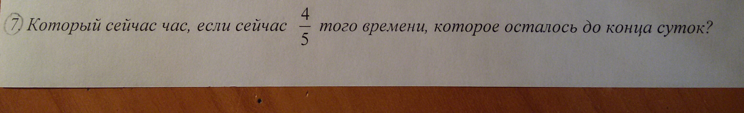 КОТОРЫЙ СЕЙЧАС ЧАС, ЕСЛИ СЕЙЧАС 4/5(это обыкновенная дробь) ТОГО ВРЕМЕНИ, КОТОРОЕ ОСТАЛОСЬ ДО КОНЦА СУТОК?
