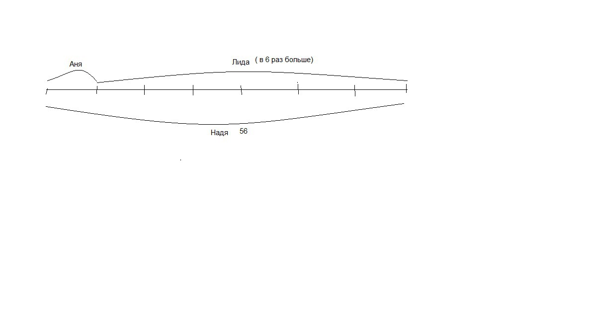 Лида собрала листьев в 6 раз больше чем Аня, а Надя собрала листьев столько же сколько Лида и Аня вместе. Сколько листьев собрала Аня если Надя собрала их 56? Сколько листьев собрала Лида? Нарисуй схему, соответствующую условию задачи, и запиши её решение по действиям. 3 класс,Х как неизвестное еще не проходили!