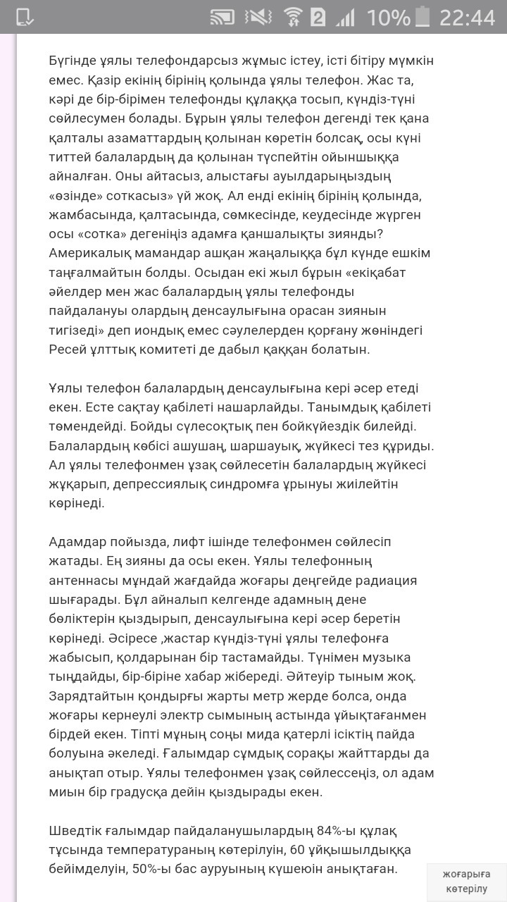 Помогите пожалуйста написать небольшой текст на казахском языке на тему Менің ұялы телефон-мой сотовый телефон,можно использовать любую модель и в конце сделать вывод:чем он вредит и чем помогает,очень нужно!в течении 30-50 минут
