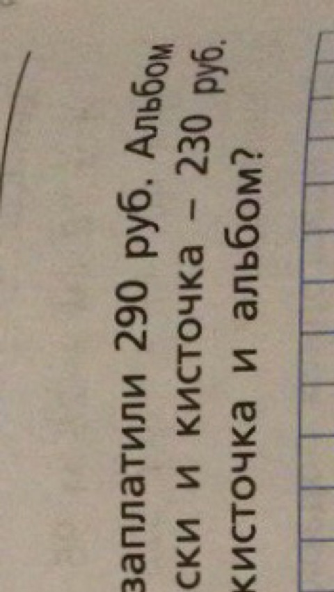 290 - 230 = 60 р , осталось после кисточки и альбома