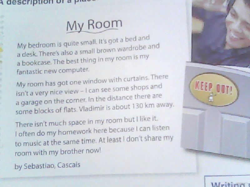 В моей комнате не так уж и много места, но мне она всё равно нравится. Я часто делаю здесь своё домашнее задание потому, что в то же время я слушаю музыку. И сейчас, я наконец-то больше не делю свою комнату с моим братом!