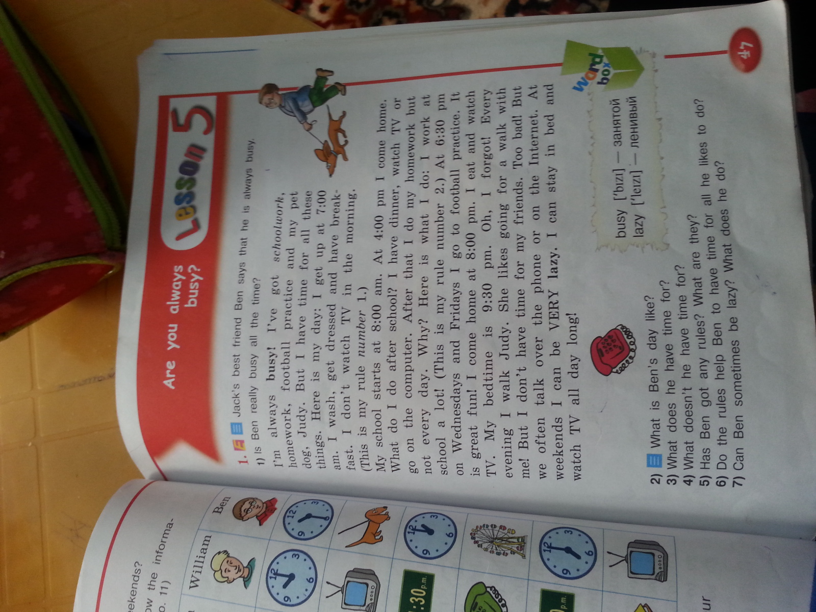 Я всегда занят! У меня работа в школе, домашнее задание, занятия по футболу и моя собака Джуди. Но у меня есть время для всех этих вещей. Вот мой день: я встаю в 7 часов утра. Я умываюсь, одеваюсь и завтракаю. Я не смотрю телевизор утром. (Это моё правило №1).