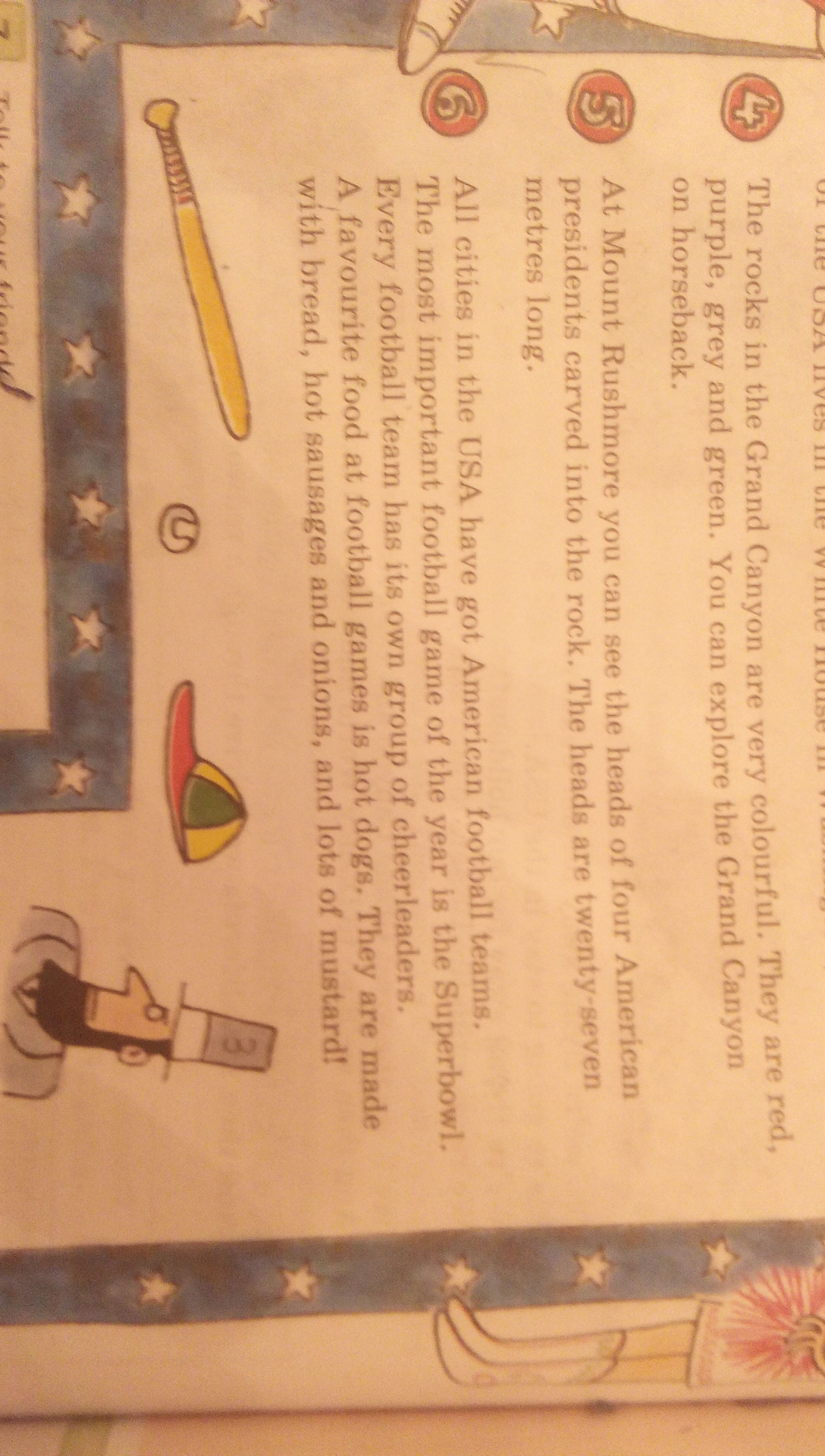 4 скалы в большом каньоне очень красочные. Они вновьфиолетовый, серый и зеленый. Вы можете исследовать Гранд-Каньонна коне5 на горе Рашмор можно увидеть головы четырех американскихпрезидентов, высеченные в скале. Глав двадцать семьметров в длину.6 Все города в США у американских футбольных команд.Самый важный футбольный матч года-СупербоулКаждая футбольная команда имеет свою группу поддержки.Любимая еда на футбольных играх хот-доги. Они сделаныс хлебом, горячие колбаски и лук, и много горчицы!