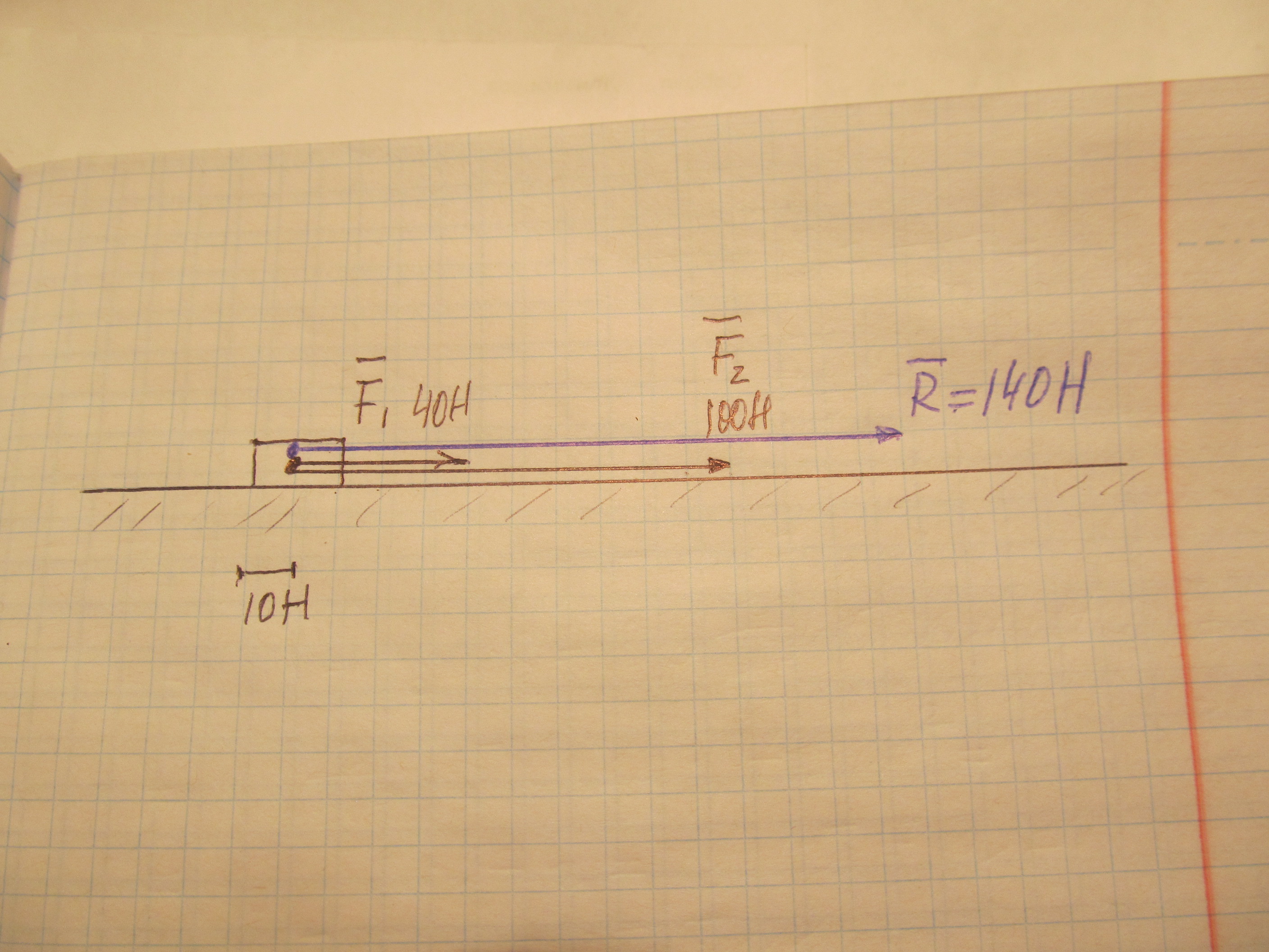 ПОМОГИТЕ ПРОШУ!Мальчик тянет санки, прикладывая в горизонтальном направлении силу F1=100 H. Сзади санки в горизонтальном направлении толкает его друг с силой F2=40H. Определите равнодействующую сил и изобразите силы, выбрав соответсвующий масштаб