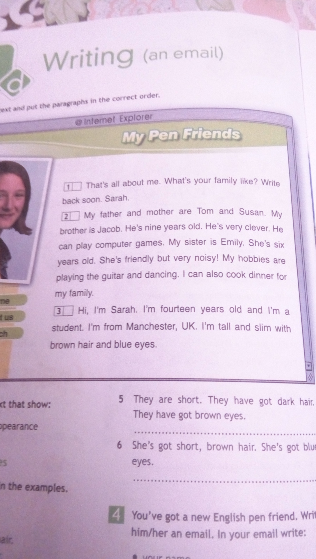 1Это все обо мне. Что твоей семье нравится? пиши мне в ближайшее время. Сара. 2 Мой отец и мать Том и Сьюзен. Мой брат джаков. Ему девять лет. Он очень умный. Он может играть в компьютерные игры. Моя сестра Эмили, ей шесть лет. Она дружелюбно, но очень шумная! Мои увлечения игра на гитаре и танцы. Я также могу приготовить ужин для своей семьи. 3 Привет, я Сара. мне четырнадцать лет и я студентка. Я из Манчестера, Великобритания. Я высокая и стройная с каштановыми волосами и голубыми глазами.