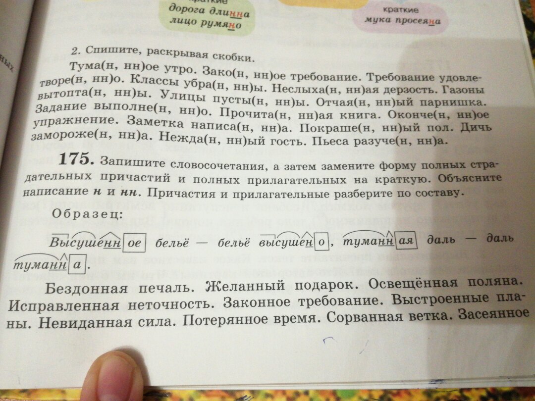 Туманное утро, законное требование, требование удовлетворено, классы убраны, неслыханная дерзость, газоны вытоптаны, улицы пустынны, отчаянный парнишка, задание выполнено, прочитанная книга, оконченное упражнение, заметка написана, покрашенный пол, дичь заморожена, нежданный гость, пьеса разучена